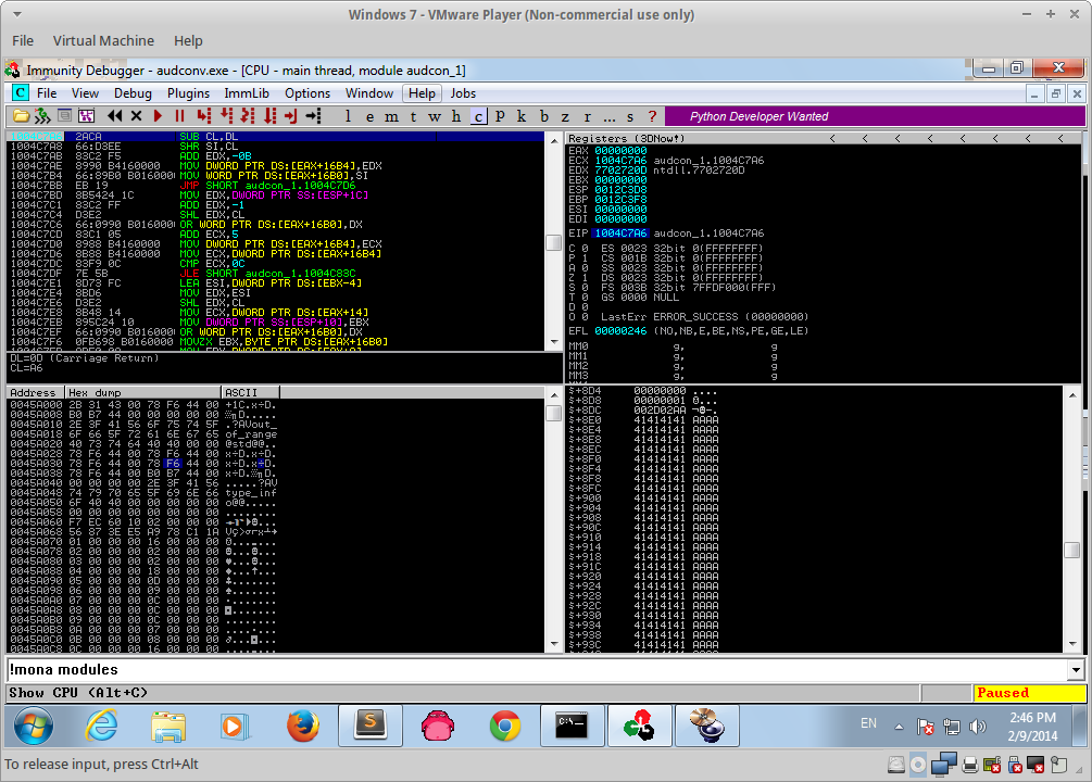 At this point what we could do is create our own ROP chain using any of the techniques from Corelan’s tutorial over at https://www.corelan.be/index.php/2010/06/16/exploit-writing-tutorial-part-10-chaining-dep-with-rop-the-rubikstm-cube/ however we have a much simpler tool: mona.py!