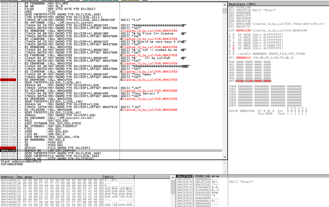 With a understanding of most of the crackme’s algorithm, we now turn to OllyDBG to understand the floating point instructions and how they change the final serial that is generated.