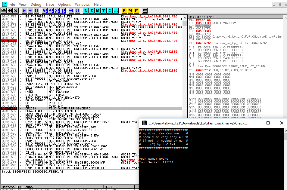 do some instructions with floating point numbers. We’ll get into this with OllyDBG in a bit but for now just now that there is a separate stack which is used for floating point numbers and these instructions use that stack to adjust our calculated serial somewhat.