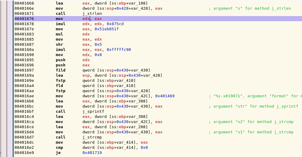 , which is hit after the first part of the menu is printed out. If we scroll down we should see the same disassembly as in Hopper, with the first floating point instruction occurring at 0x00401697