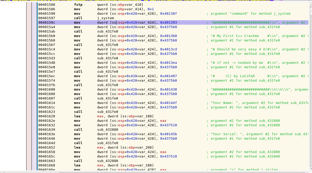 Looking at the assembly, we can see there are several strings which appear to be loaded into the variables var_424
