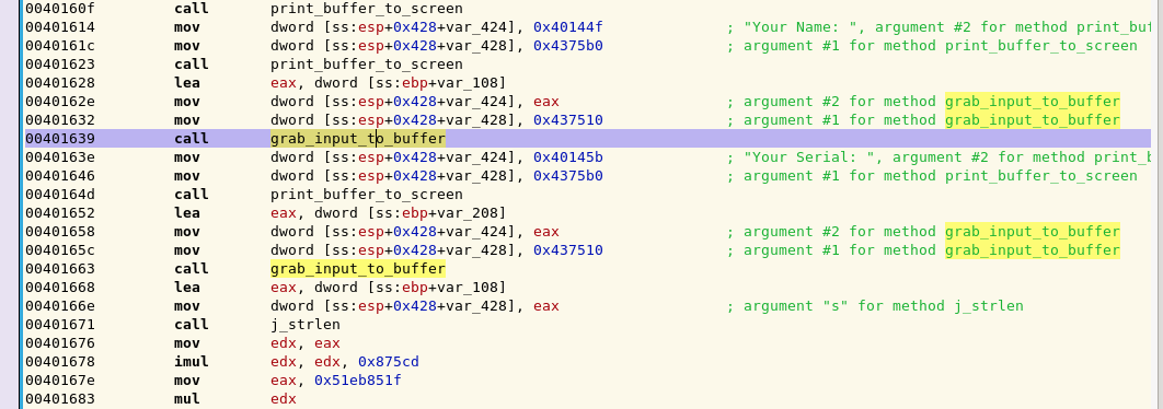 , or the buffer where our name was stored earlier. Lets see what the program does once it has calculated the length of the name that we inputted into the program: